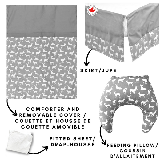 Literie bébé cerf gris et blanc - Ensemble de 5 pièces (avec coussin d'allaitement)